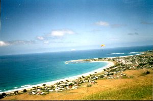 Landing on the beach or in the paddocks below should cause no problems but beware of powerlines, fences and gullies. There are also power lines in amongst the pine trees just before the beach.