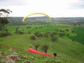 As with all inland sites, thermals can generate considerable turbulence and heavy sink. Maintain adequate clearance at all times. The face, although clear of trees is steep and rocky. Side landings are possible but can be dangerous especially for inexperienced pilots. If the bottom landing paddock is cropped considerable skill is required to land before it and the site is not suitable for novices or for hanggliders in such a situation.