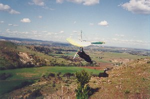 The site should not be flown in winds greater than 10 - 15kts. 10kts is perfect, if from due north. If the wind has any West in it whatsoever, don't even bother to set up. DO NOT fly downwind of the "lump" hill to the right. Sink City! Watch out for fierce wind gradients in the ample on top landing area behind takeoff, and power lines and fences below. The landing area at the bottom is very small, and it is a good idea to check with fliers who know the site as to which paddock you are allowed to land in. Do not forget, you will be landing in the lee of a very large hill, so expect still air at the best, or extreme turbulence at the worst. If the rifle club is operating, and it usually is on weekends, stay away from the Western end of the ridge!